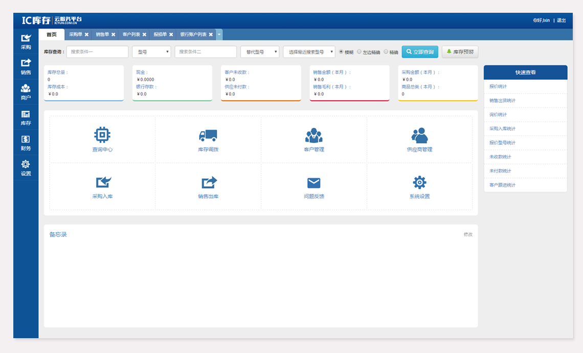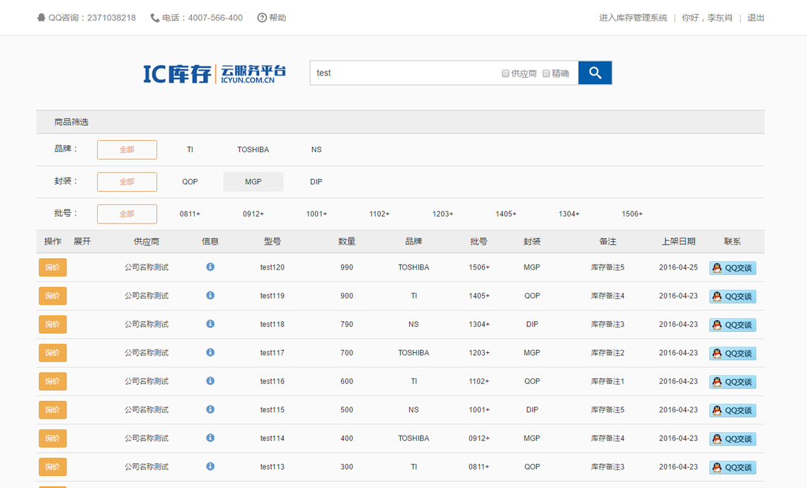 IC库存云服务平台是一款专门为IC行业高度定制的全方位ERP管理系统,拥有一套完整的进销存系统,能够为广大的客户提供国内各大工厂的呆料信息及各大商家的自有库存等信息。